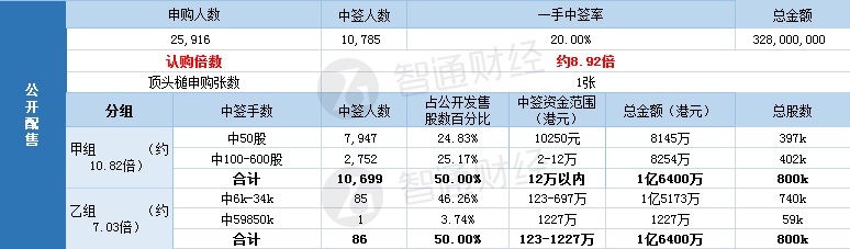 其中,公开配售申购人数25916人,一手中签率20%,认购倍数约8.92倍。