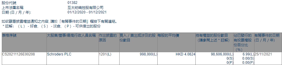 PLC减持互太纺织(01382)99.8万股,每股作价4.0824港元,总金额约为407.42万港元。减持后最新持股数目约为9860.6万股,最新持股比例为6.99%。