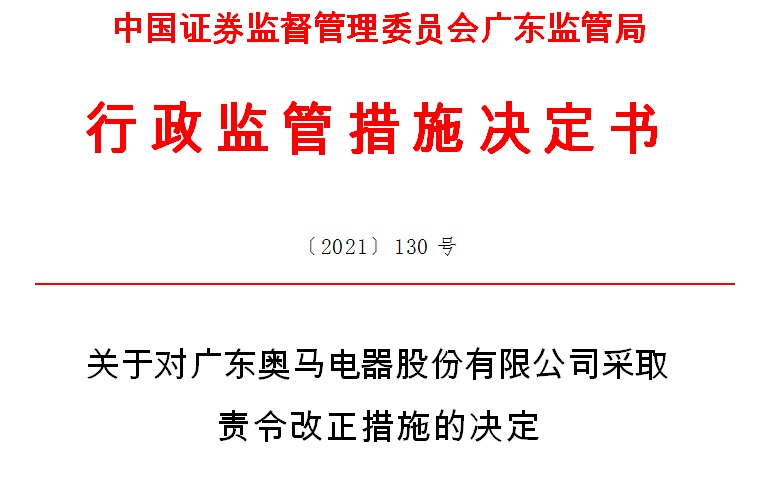 广东证监局提出:要求ST奥马收到本决定书30日内向我局报送整改报告、内部问责情况,并抄报深圳证券交易所。