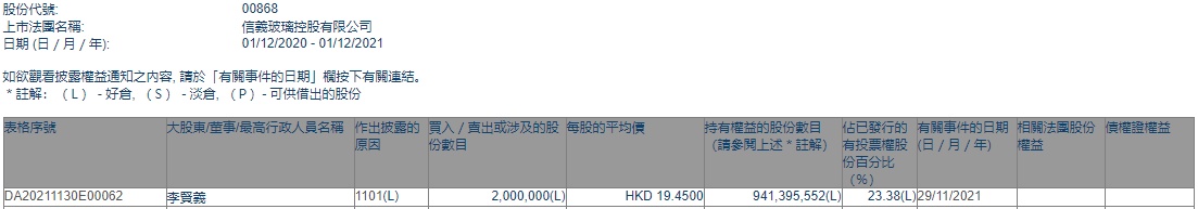 智通财经APP获悉,香港联交所最新资料显示,11月29日,执行董事兼主席李贤义增持信义玻璃(00868)200万股,每股作价19.4500港元,总金额为3890万港元。增持后最新持股数目为9.41亿股,最新持股比例为23.38%。