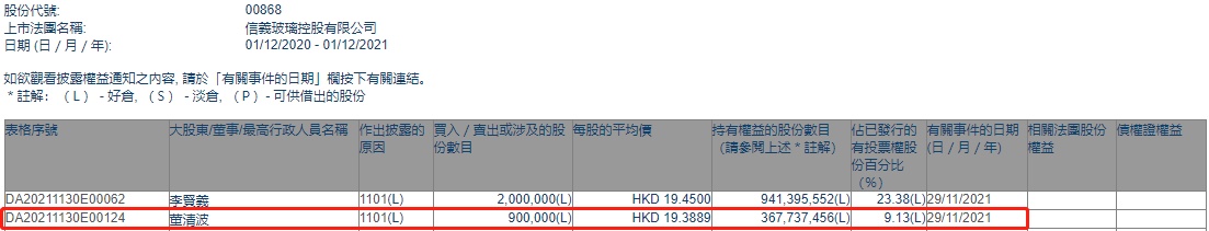 智通财经APP获悉,香港联交所最新资料显示,11月29日,执行董事兼副主席董清波增持信义玻璃(00868)90万股,每股作价19.3889港元,总金额约为1745万港元。增持后最新持股数目约为3.68亿股,最新持股比例为9.13%。