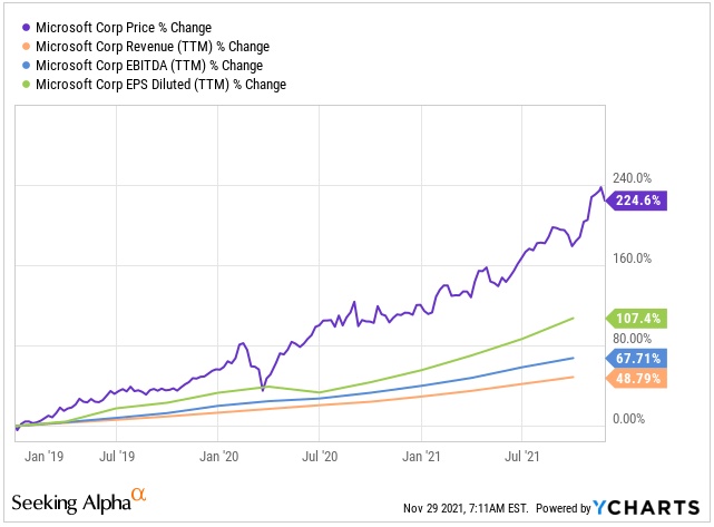 另外,如下图所示,微软股价涨幅已经超过了其营收、息税折旧摊销前利润(EBITDA)和每股收益的增幅。