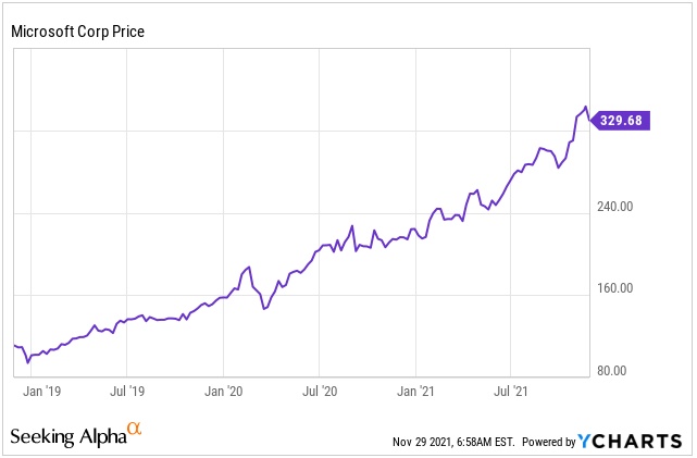 近几年来,微软股价在市场中一直处于绝对优势,即使是在2020年3月因新冠疫情导致的市场崩溃,也似乎只是一次小插曲。该股目前股价超过每股330美元,接近历史高点。