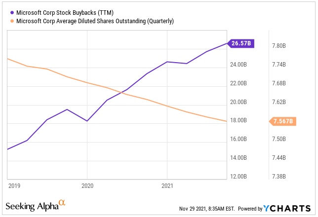首先,微软一直在积极回购股票。微软的回购计划要求回购至多600亿美元的股票,约占市值的2.5%。如下图所示,该公司的股票数量一直在稳步下降,在过去三年下降了2%以上。与此同时,股票回购也在稳步增加。