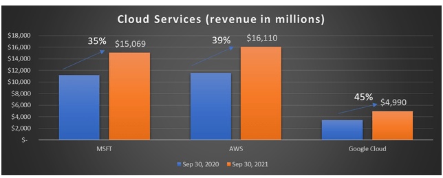 其次,如前所述,微软的云服务在2022财年第一季度实现加速增长。目前,云服务是众多科技公司追求快速发展的市场,而微软的云服务直面如亚马逊(AMZN.US)的AWS和谷歌(GOOGL.US)的云服务Google Cloud等强大的对手。但值得注意的是,微软的财报显示,在截至2021年9月30日的季度内,公司仅Azure业务就实现了同比增长50%。