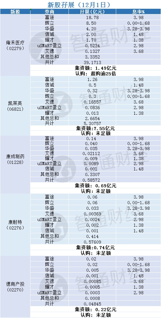 智通财经APP获悉,雍禾医疗(02279)、凯莱英(06821)、康成制药(01228)、康耐特(02276)、德商产投(02270)正在招股中。截至12月1日,富途、华盛、辉立等合计分别为其借出孖展39.1713亿港元、5.30757亿港元、0.58572亿港元、0.57609亿港元、0.04845亿港元,雍禾医疗超购逾25倍,其余认购均未足额。