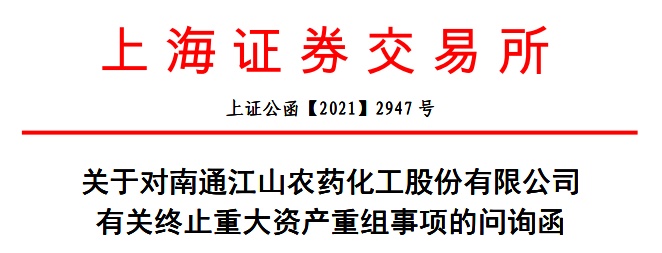 智通财经APP获悉,12月1日,上交所向南通江山农药化工股份有限公司(江山股份,600389.SH)有关终止重大资产重组事项发出问询函。问询函指出,2021 年 12 月 1 日盘后,江山股份公告称,公司与相关方对交易方案尚未最终达成一致,预计不能在规定的时间内发出审议本次重大资产重组的股东大会通知,拟终止本次重大资产重组事项。上交所要求江山股份和交易对方核实并补充披露:“筹划本次重组期间推进的主要工作及重要时间节点。“等问题。