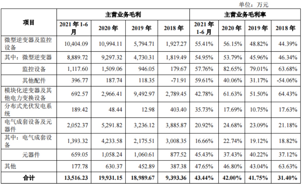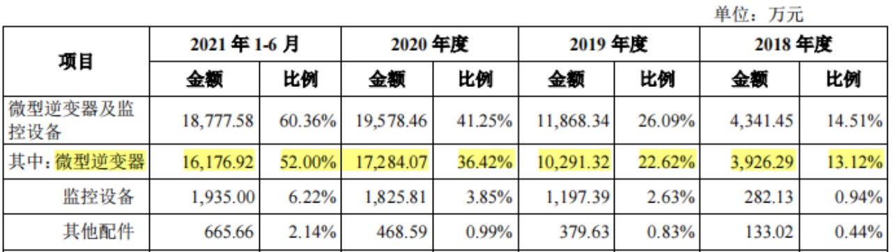 其中,又尤以微型逆变器业务为禾迈股份业绩爆发的核心推动力。期内,该业务的收入由2018年的3926.29万元快速提升至2020年的1.73亿元,且今年前六个月收入已达到1.62亿元。