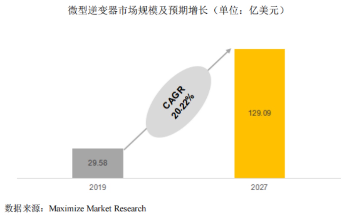 公开资料显示,当前随着光伏行业在市场和技术方面的不断演变,光伏平价上网时代逐步来临,产业链商业逻辑悄然生变,分布式光伏正逐步成为后续光伏市场的重要增量。在此背景下,微型逆变器作为小型、组件级分布式发电系统的最优方案,增长预期明确。根据Maximize Market Research的研究,当前微型逆变器2019年全球市场为已达约30亿美元,且在未来数年内报告20%的年化增长率,至2027年增长至约130亿美元。
