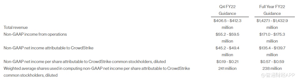 CrowdStrike预计,第四季度营收为4.065-4.123亿美元,Non-GAAP归属公司净利润为4520-4940万美元,Non-GAAP摊薄每股收益为0.19 - 0.21美元。