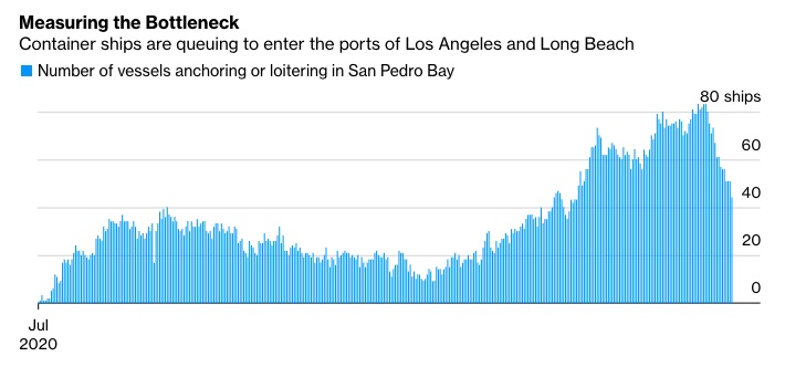 尽管政府努力港口拥堵,但仍未能解决长时间延误的问题。截至周二,仍有49艘集装箱船停泊在南加州海岸等待进入港口,但与几周前80多艘船等待相比,情况似乎有所好转。