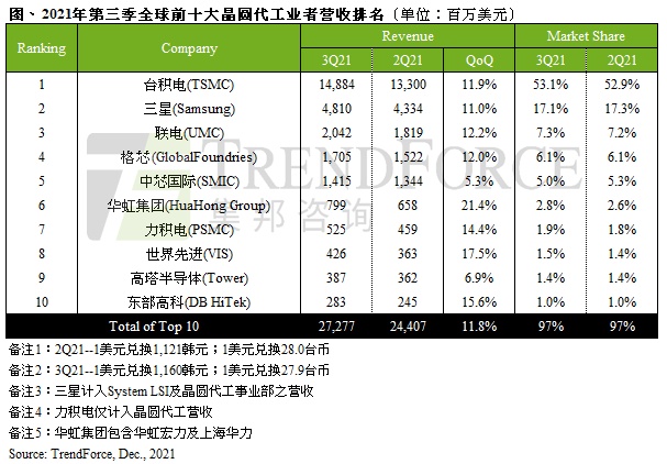 排名第五的中芯国际(00981)受惠于PMIC、Wi-Fi、MCU、RF等产品需求稳定,以及持续调涨晶圆价格等因素,第三季营收达14.2亿美元,季增5.3%。值得注意的是,中芯国际调整了产能分配与客户结构,中国国内客户占比逐季提高,第三季中国客户占比已达近7成。