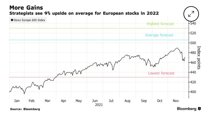 摩根大通策略师Mislav Matejka表示:“我们相信市场上推动股价上涨的积极因素还没有枯竭,随着对滞涨的担忧消退,股市明年可能进一步上涨。”他认为斯托克600指数明年年底的目标位为525点。“虽然omicron变体会为市场带来一定的不确定性,但影响一般都集中在短期内,因此,不太可能会成为明年股市波动的重要因素,”他补充道。