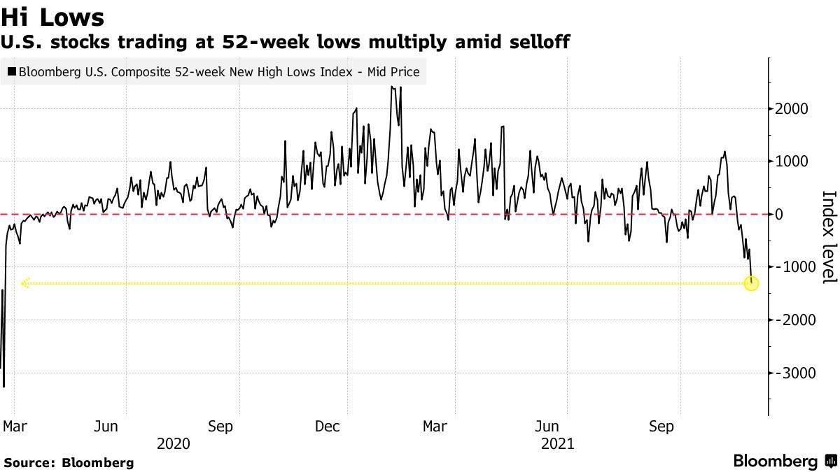 智通财经APP注意到,这是自去年新冠疫情引发的剧烈恐慌性抛售以来美股市场遭遇的最大抛售力度,至少根据一项追踪美股触及52周低点相对中值和高点的统计指标来看是如此。