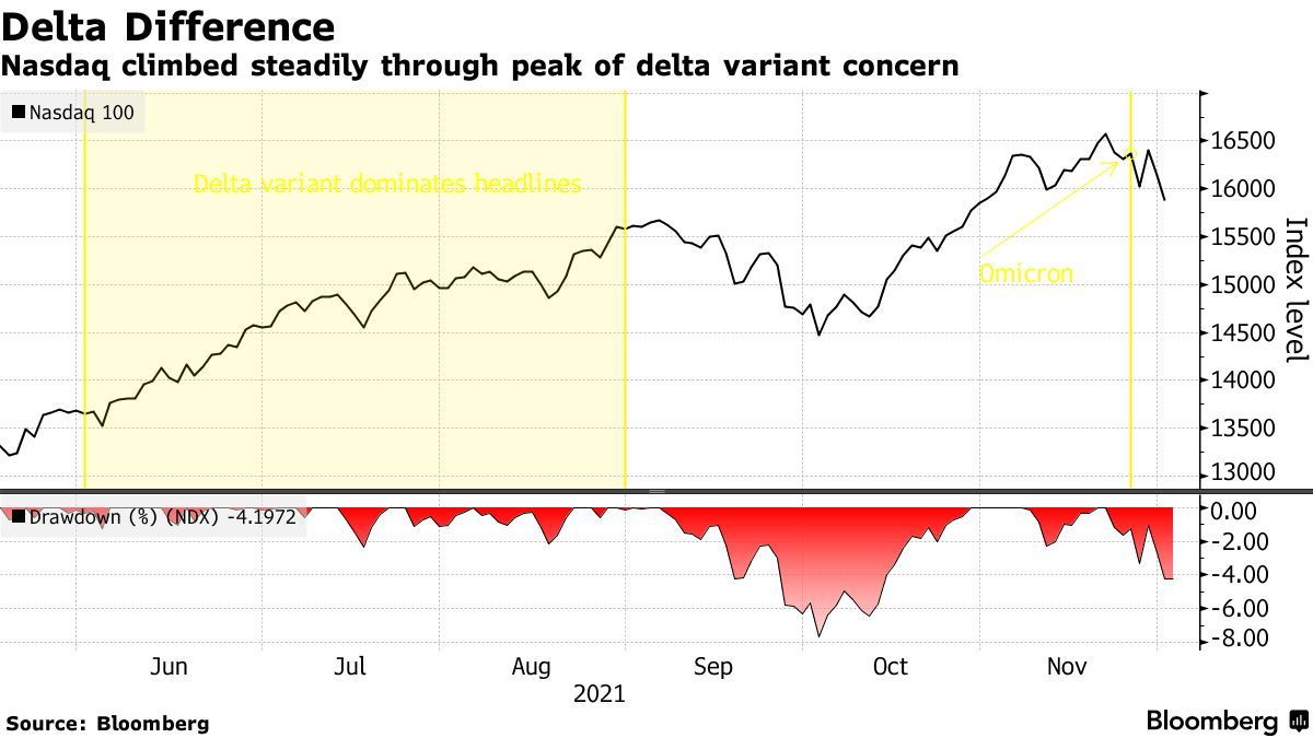 纳斯达克100指数在6月、7月和8月的“德尔塔病毒蔓延加剧”时期逆势上涨了14%,但自感恩节后Omicron首次引发市场恐慌以来,该指数已经下跌了3%,比德尔塔变异病毒开始在美国社区蔓延时的跌幅大得多。