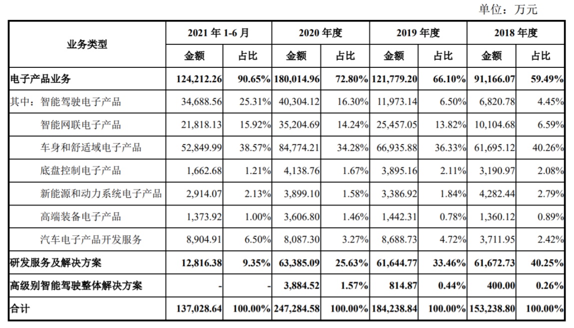 该业务的收入也在逐年上升,占总收入的比例持续增多,于报告期内,经纬恒润2018至2020年度以及2021年前六个月,总收入分别为15.32亿元、18.42亿元、24.73亿元以及13.7亿元。其中电子产品业务的收入分别为9.12亿元、12.18亿元、18亿元以及12.42亿元,所占比例分别达到59.49%、66.1%、72.8%以及90.65%。