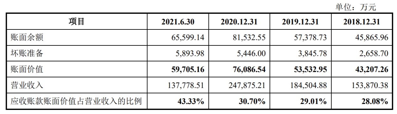 报告期内,经纬恒润的应收账款账面价值分别为4.32亿元、5.35亿元、7.61亿元以及5.97亿元,占营业收入的比例分别为28.08%、29.01%、30.7%以及43.44%。