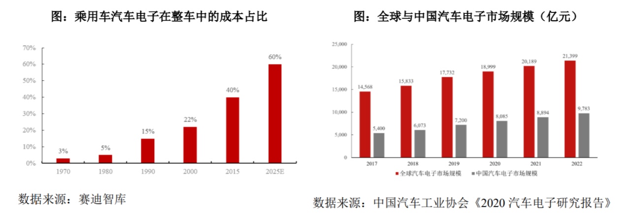 由于单车上汽车电子的成本增长,使其在整车的成本中比重上升。根据赛迪智库的数据,以乘用车为例,成本已经从1970年的3%上涨至2015年的40%,预计2025年将达到60%。同时伴随着汽车电子化的水平逐渐提升,以及单车的汽车电子成本提高,汽车电子市场规模将不断扩大。预计2022年,全球汽车电子市场规模为21399亿元,而我国该市场规模将达到9783亿元。