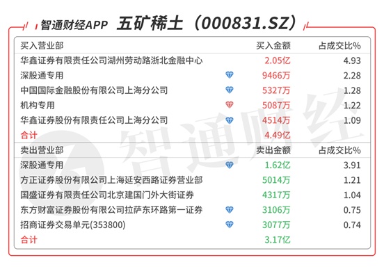 五矿稀土(000831.SZ):多主力现身龙虎榜,机构席位对倒净买入2263万元,深股通对倒,买一是知名游资的席位买入2.05亿元,买五是知名游资的席位买入4514万元,当日净买入1.36亿元,该股今日强势涨停,预计走趋势为主。