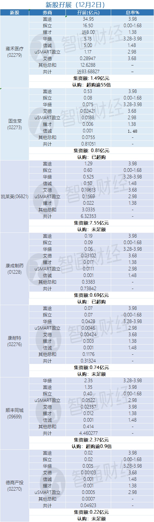 智通财经APP获悉,雍禾医疗(02279)、固生堂(02273)、凯莱英(06821)、康成制药(01228)、康耐特(02276)、顺丰同城(09699)、德商产投(02270)正在招股中。截至12月2日,富途、华盛、辉立等合计分别为其借出孖展近83.68827亿港元、0.81051亿港元、6.32353亿港元、0.73842亿港元、0.31324亿港元、4.460277亿港元、0.04923亿港元,其中康成制药及固生堂已超购,雍禾医疗超购逾55倍,顺丰同城超购逾0.9倍,康耐特、凯莱英与德商产投认购均未足额。