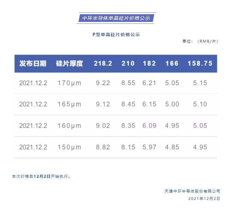 智通财经APP获悉,12月2日,中环股份(002129.SZ)下调硅片价格,对标此前11月的硅片价格,G1硅片下降0.52元/片,报价5.15元/片,降幅9.1%;M6硅片下降0.72元/片,报价5.05元/片,降幅12.48%;G12硅片(170μm)下降0.55元/片,报价8.55元/片,降幅6.04%。新增M10硅片报价,6.21元/片,新增超大硅片218.2mm,报价9.22元/片。