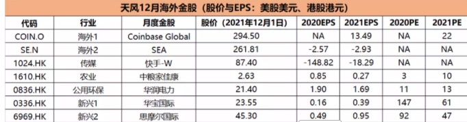 关于12月海外金股,天风证券的基本假设和目标价分别如下: