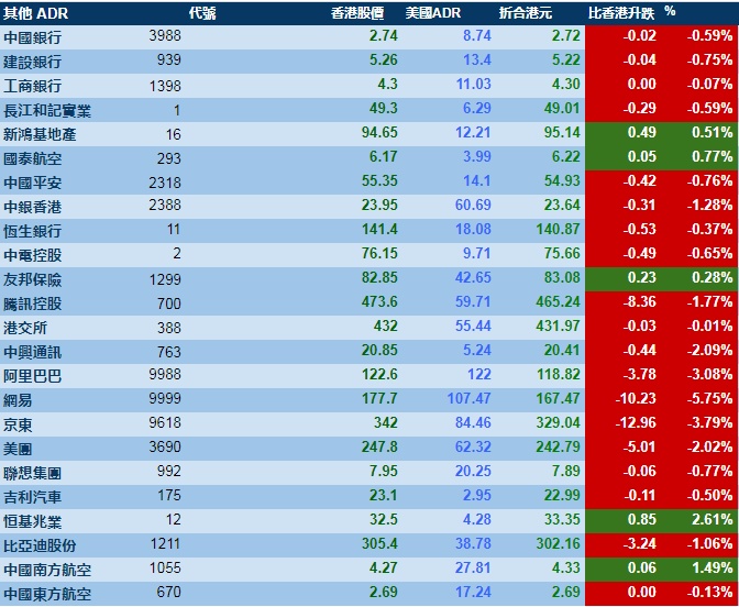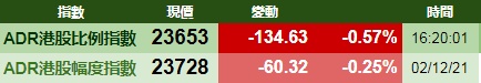 智通财经APP获悉,周四美股三大指数集体收涨,港股ADR指数下跌,按比例计算,收报23653点,跌134.63点或0.57%。