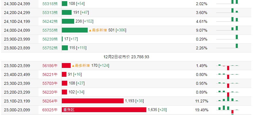 牛证街货重货区在23,000-23,099区间,该区间最新牛证数量为1635张,较上一交易日增加28张;最多新增在23,500-23,599区间,该区间最新牛证数量为170张,较上一交易日增加124张。