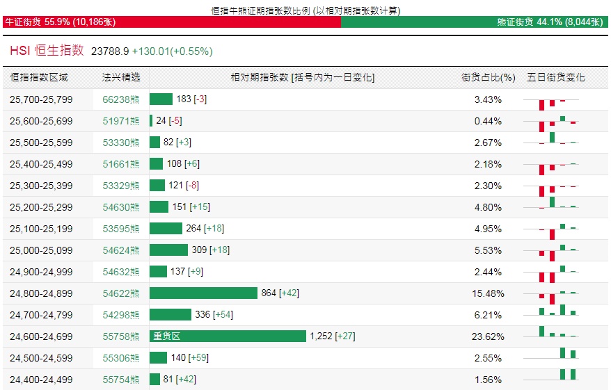 法兴恒指牛熊证街货分布图中的数据显示,熊证街货重货区在24,600-24,699区间,该区间最新熊证数量为1252张,较上一交易日增加27张;最多新增在24,000-24,099区间,该区间最新牛证数量为501张,较上一交易日增加306张。