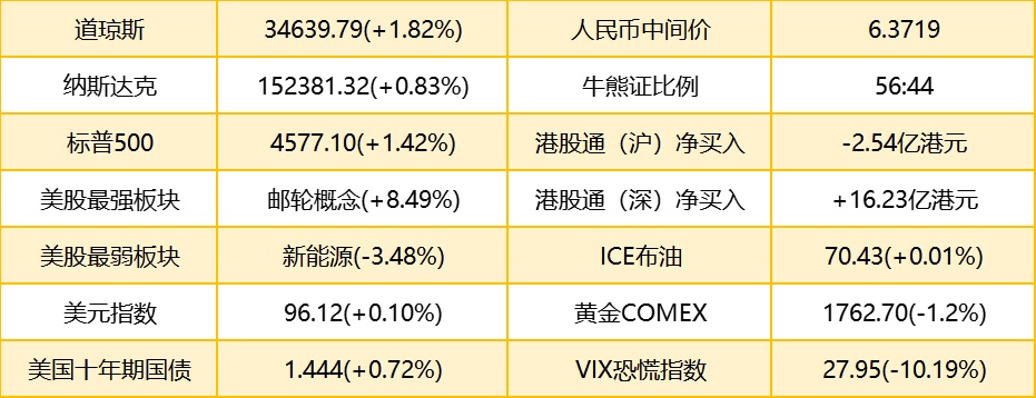 1. 隔夜美股道指涨617.75点或1.82%,报34639.79点;纳指涨127.27点或0.83%,报15381.32点;标普500指数涨64.06点或1.42%,报4577.10点。港股ADR指数下跌,按比例计算,收报23653点,跌134.63点或0.57%。