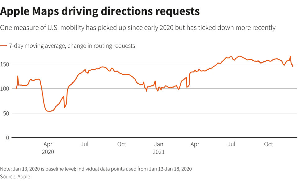 道明证券(TD Securities)关注的移动性指标之一是使用苹果地图(Apple Maps)获取行车方向的请求,该请求量近期有所下降。其他数据还包括运输安全管理局(Transportation Security Administration)跟踪的检查站、餐厅预订和酒店入住率。