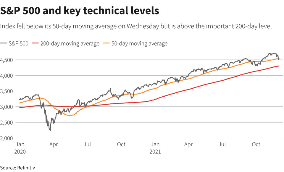 投资者也在关注重要的技术水平,以评估市场受损的程度。周三,道琼斯工业平均指数(DJI)自2020年7月以来首次收于200日移动均线以下,这可能是一个看跌迹象。基准标准普尔500指数仍高于200日水准,但周三收于50日移动均线下方,为10月中以来首次。