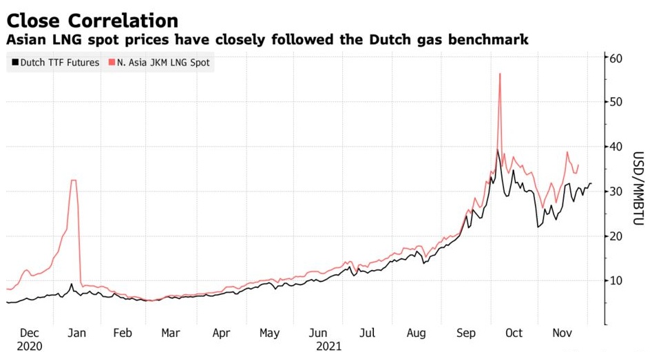 亚洲天然气现货基准日本-韩国市场指数(Japan-Korea Marker)的流动性近年来大幅增加,但其仍以TTF为基准,这使TTF成为交易员更值得信赖的选择。今年许多海外液化天然气供应交易都与TTF有关。去年,亚洲液化天然气价格与荷兰走势一致。