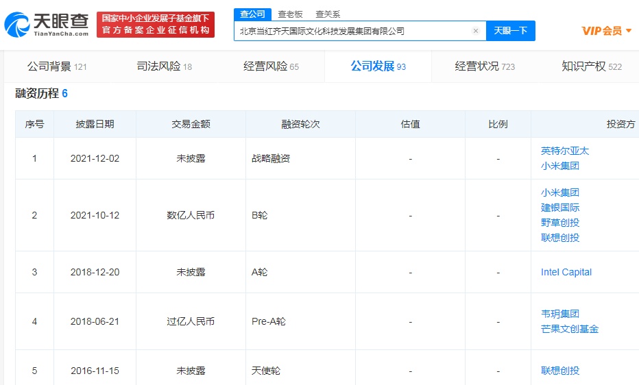 据公开资料显示,当红齐天是一家致力于创造极致沉浸式体验,集“XR内容制作+载具研发+数字运营整体解决方案及产品落地”于一体的文化科技公司。今年10月12日,当红齐天完成小米战投、建银国际领投的数亿元B轮融资,跟投方为野草创投和老股东联想创投。