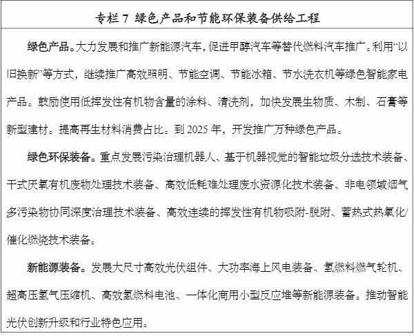 大力发展绿色环保装备。研发和推广应用高效加热、节能动力、余热余压回收利用等工业节能装备,低能耗、模块化、智能化污水、烟气、固废处理等工业环保装备,源头分类、过程管控、末端治理等工艺技术装备。加快农作物秸秆、畜禽粪污等生物质供气、供电及农膜污染治理等农村节能环保装备推广应用。发展新型墙体材料一体化成型、铜铝废碎料等工业固废智能化破碎分选及综合利用成套装备,退役动力电池智能化拆解及高值化回收利用装备。发展工程机械、重型机床、内燃机等再制造装备。