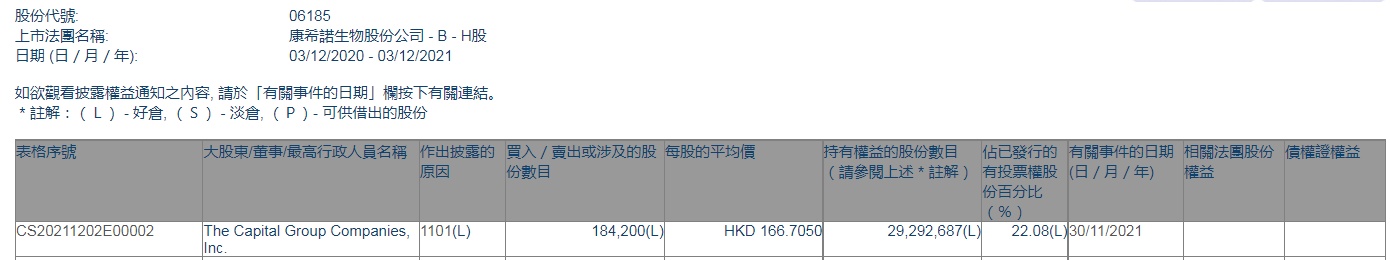 智通财经APP获悉,香港联交所最新资料显示,11月30日,The Capital Group Companies, Inc.增持康希诺生物-B(06185)18.42万股,每股作价166.7050港元,总金额约为3070.71万港元。增持后最新持股数目约为2929.27万股,最新持股比例为22.08%。
