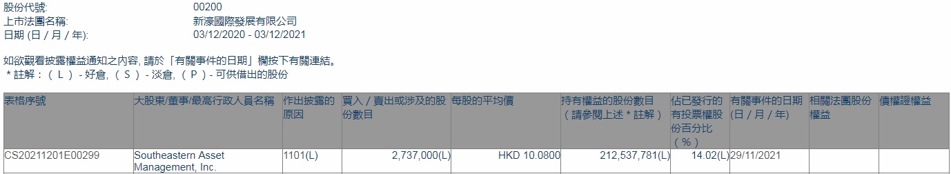 智通财经APP获悉,香港联交所最新资料显示,11月29日,Southeastern Asset Management, Inc.增持新濠国际发展(00200)273.7万股,每股作价10.08港元,总金额约为2758.9万港元。增持后最新持股数目约为2.13亿股,最新持股比例为14.02%。