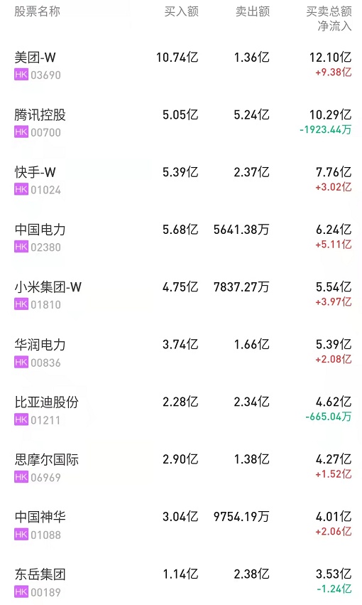 北水净买入最多的个股是美团-W(03690)、中国电力(02380)、快手-W(01024)。北水净卖出最多的个股是建设银行(00939)、东岳集团(00189)、舜宇光学(02382)。