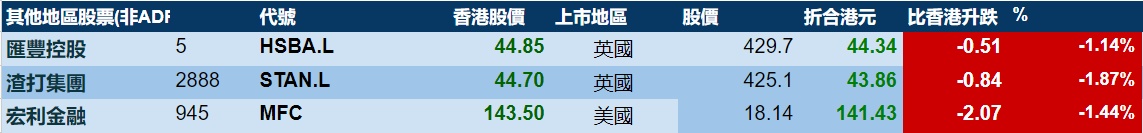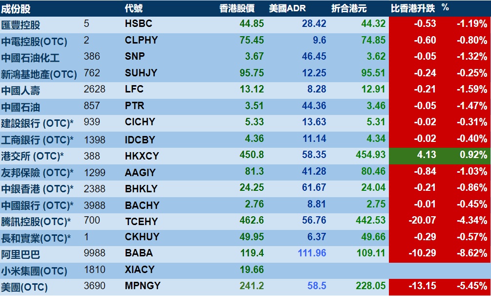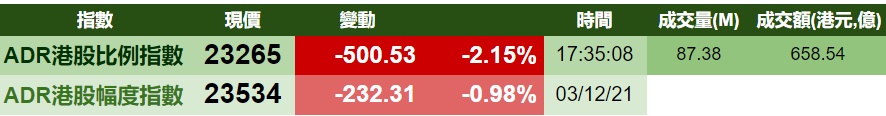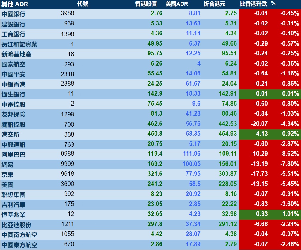 周五美股三大指数剧烈调整,港股ADR指数下跌,按比例计算,收报23265点,跌500.53点或2.15%。