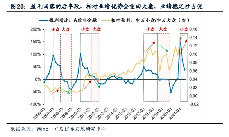 首先,从盈利周期来看,22年是盈利回落的后半段,相对业绩优势回重回大盘。历史上大小盘的相对业绩优势对中期的风格走势有指向作用,而相对业绩优势又和盈利的波动周期有关——在盈利改善的后半段、或盈利刚从高点回落的初期,由于小市值公司的业绩弹性更大,因此相较大市值有相对的业绩优势 (例如21年);而随着22年A股非金融整体将降速至0增长附近,在历史上每一轮的盈利下行的后半段,大市值公司的业绩稳健性将重新占优,相对业绩优势偏向大盘。