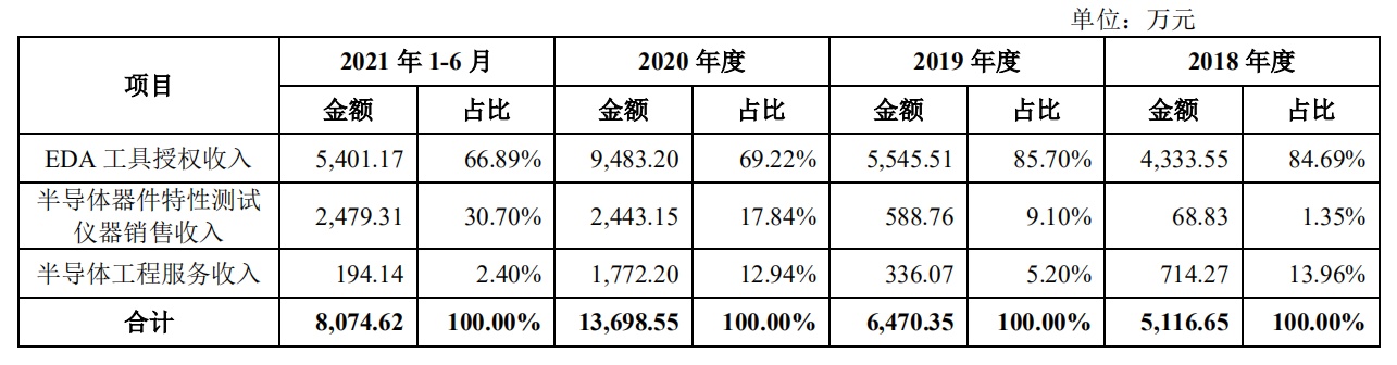 通过概伦电子的业绩可以看出,公司的主要收入来自EDA工具授权业务,2018至2020年度以及今年上半年,分别占到总收入的84.69%、85.7%、69.22%以及66.89%,收入分别为4333.55万元、5545.51万元、9483.2万元以及5401.17万元。这也带动公司总收入的增长,过去三年的年度总收入分别为5116.65万元、6470.35万元以及1.37亿元。