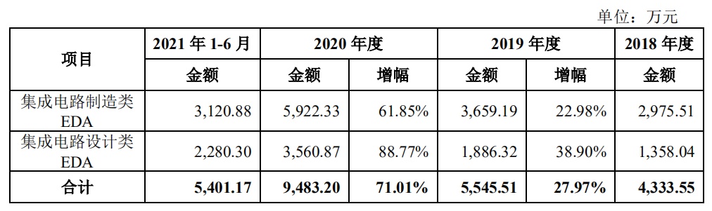 EDA工具授权业务中包括集成电路制造类EDA和设计类EDA,这两部分的增长速度较快,2019年度对比同期分别实现22.98%和38.9%的增长,2020年度的涨幅更是扩大到61.85%和88.77%。