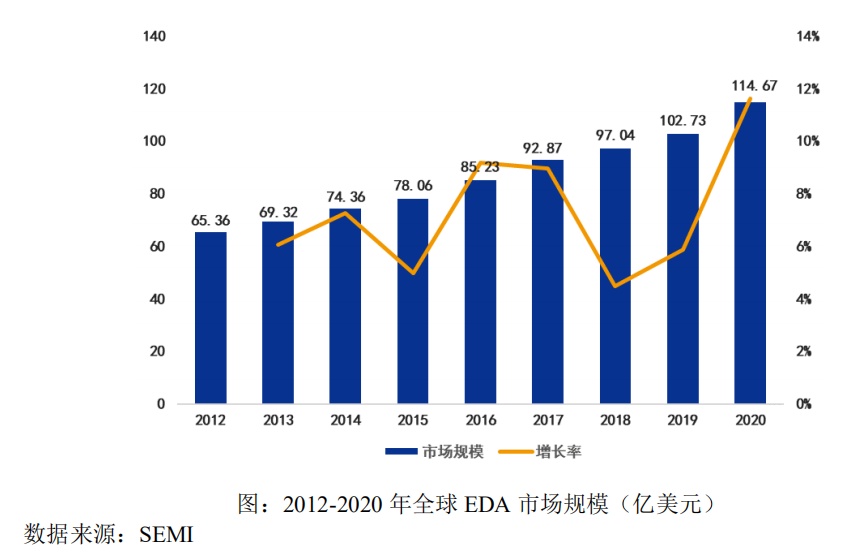 得益于技术的更新迭代,以及众多下游领域的需求增长,全球EDA市场规模处于持续上升的趋势。根据SEMI的数据,2020年全球EDA市场规模为114.67亿美元,同比增长11.63%。