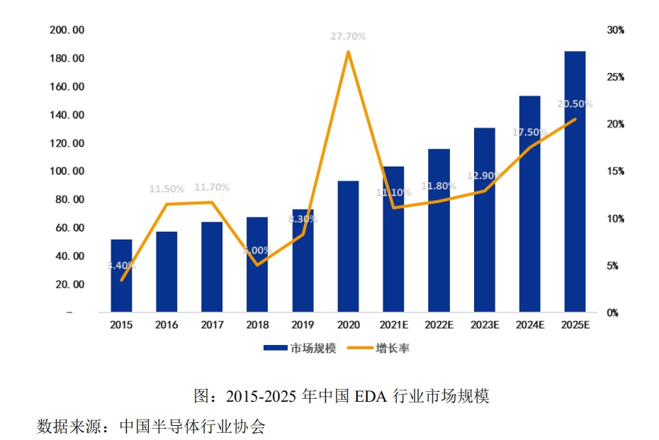 根据我国半导体行业协会的统计数据,2020年我国EDA市场规模为93.1亿元,同比增长27.7%,预计2025年将超过180亿元。另外,根据GIA的报告,我国EDA市场2020至2027年的复合年增长率预计将达到11.7%。