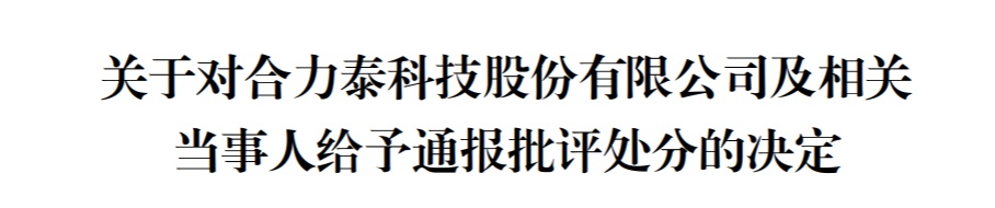 深交所作出如下处分决定:一、对合力泰科技股份有限公司给予通报批评的处分;二、对合力泰科技股份有限公司原实际控制人、时任董事长文开福给予通报批评的处分;三、对合力泰科技股份有限公司原实际控制人文开福的一致行动人、实际资金占用方曾力给予通报批评的处分;四、对合力泰科技股份有限公司时任总裁兼财务负责人陈贵生给予通报批评的处分。