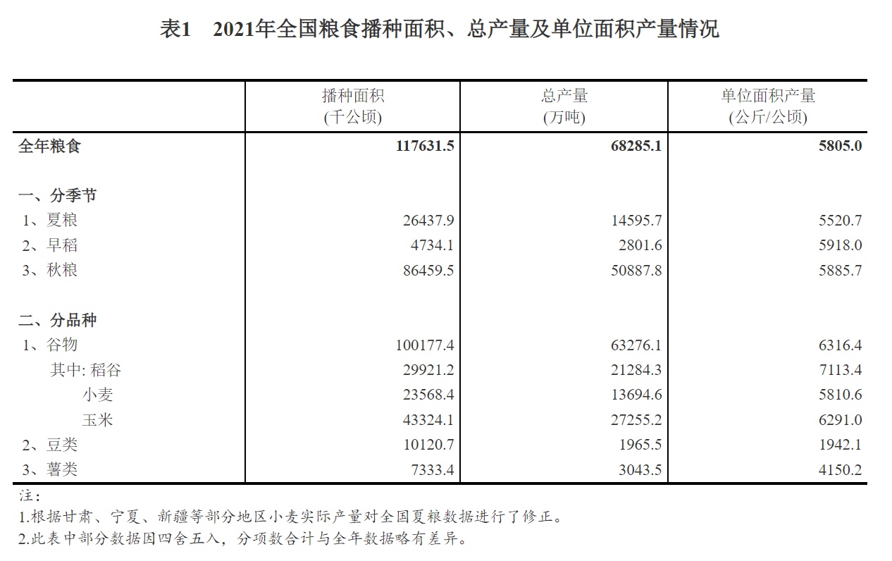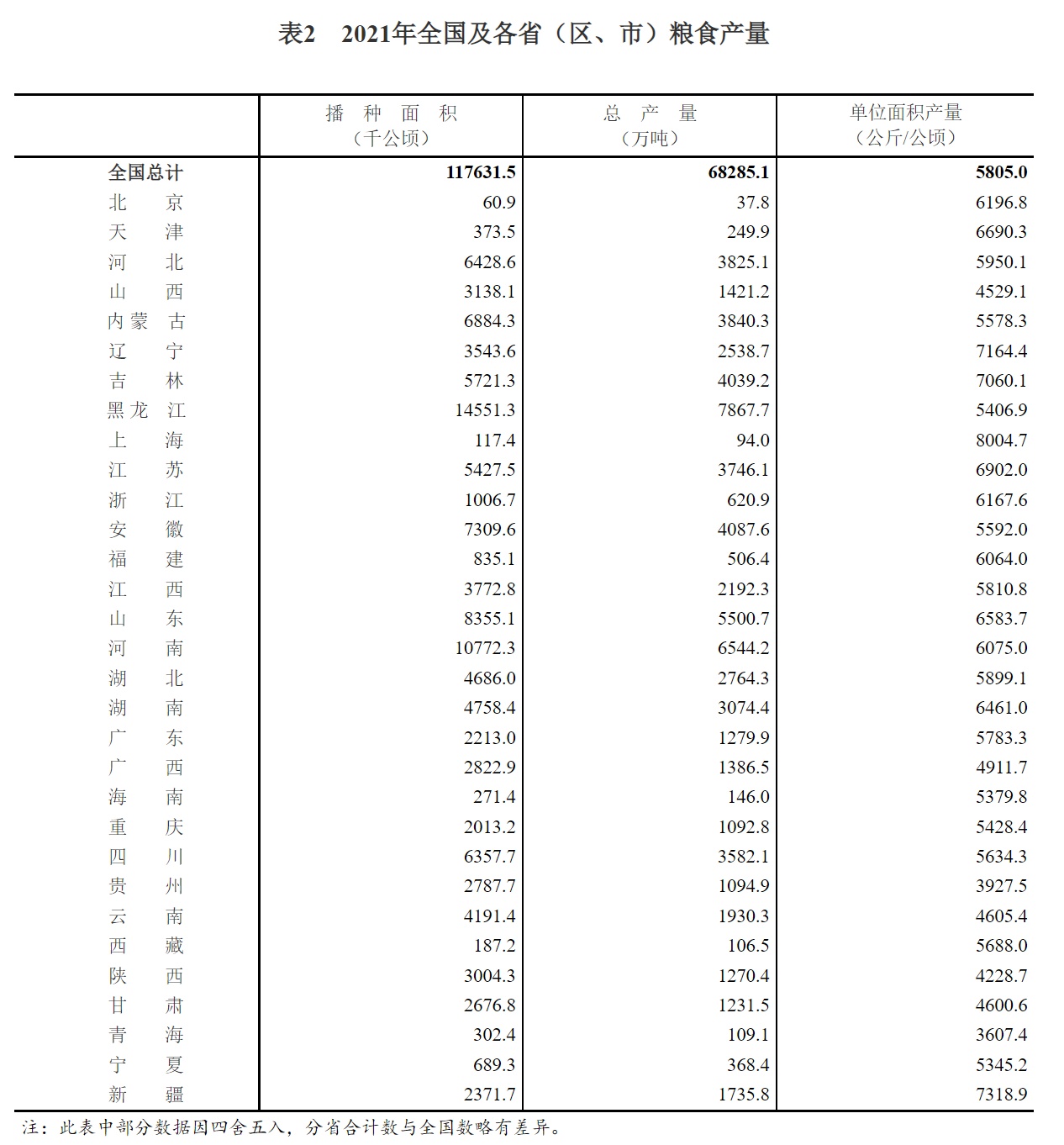 根据对全国31个省(区、市)的抽样调查和农业生产经营单位的全面统计,2021年全国粮食播种面积、单位面积产量和总产量分别如下: