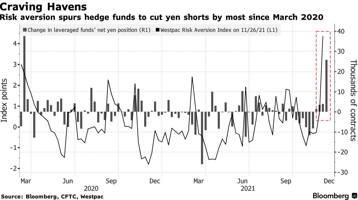 与此同时,全球正从风险资产转向日元和美国公债等避险资产,因担心新的Omicron变种将破坏全球复苏。西太平洋银行(Westpac Banking Corp.)的风险厌恶指数上月飙升至2020年2月以来的最高水平。