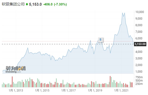 截至发稿,软银股价连续第七个交易下跌,跌至5153日元。该股今年跌幅超过35%,或再现2006年以来最大年度跌幅。
