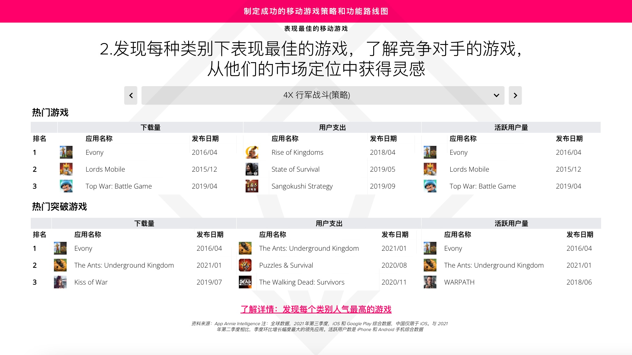 App Annie将运用先进的GAME IQ分类法来更直观的获取这些信息,以4XSLG(策略)类别为例。数据显示,在2021年第三季度,《Evony》拥有最多的下载量和活跃用户,而《万国觉醒》在用户支出方面处于领先位置。与此同时,下载量季度环比增长方面的杰出突破游戏是《TheAnts:UndergroundKingdom》。