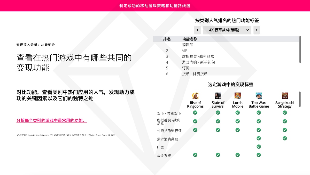 但App Annie对数据的挖掘并没有止步于此。例如,产品经理可以使用App Annie的比较游戏报告来了解特定游戏艺术风格、游戏玩法循环和变现模型的当前表现。